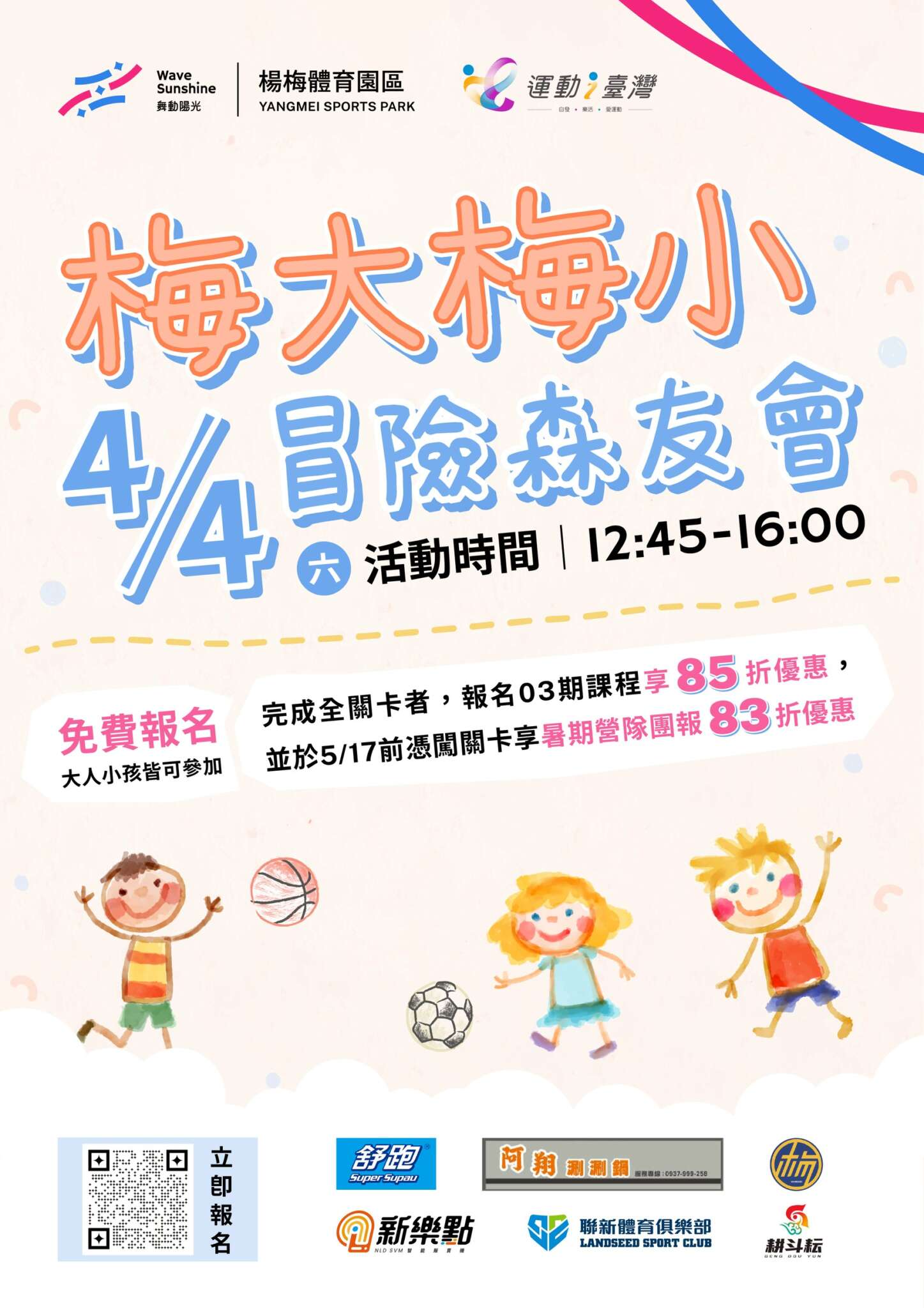 為慶祝兒童節,楊梅體育園區將於 4月4日 舉辦「梅大梅小・冒險森友會」,邀請大小朋友一同參與趣味運動闖關,在挑戰中體驗多樣化運動,共度充滿活力的假期!